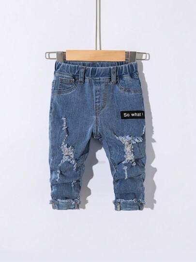 SHEIN Vaqueros azules desgastados y rotos con parches decorativos suaves para bebés, ropa de primavera/verano para bebés - Lavado ligero - Añade 1
