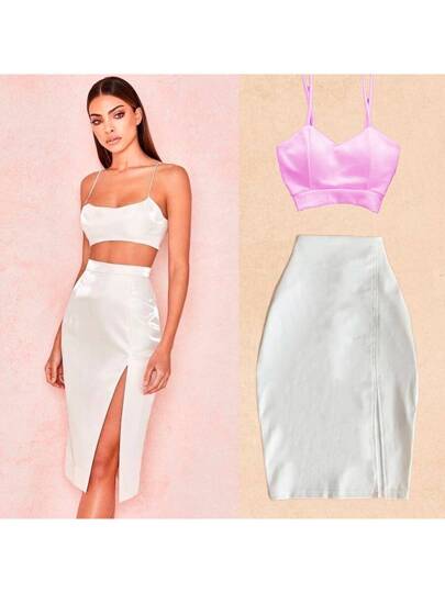 Conjunto dos piezas top corto tirantes falda midi abertura ajuste femenino - Rosa Pálido - Añade 1