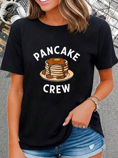 Camiseta divertida de "Equipo de Panqueques" Cute Pancake Crew, de manga corta y cuello redondo, top de algodón para mujer - Negro - Añade 1
