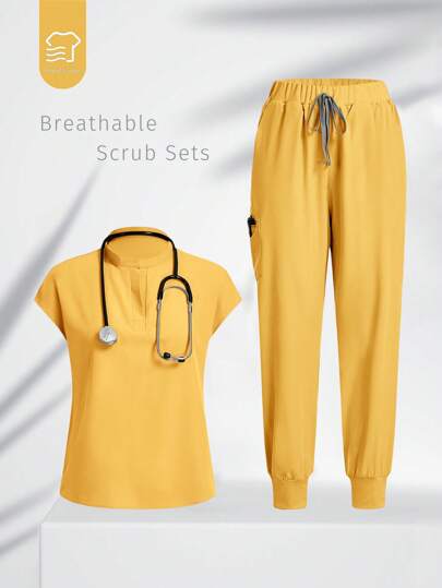 TaskEZ Conjunto de uniforme de scrubs con top de manga corta y pantalones de unicolor simple - Amarillo Mostaza - Añade 1