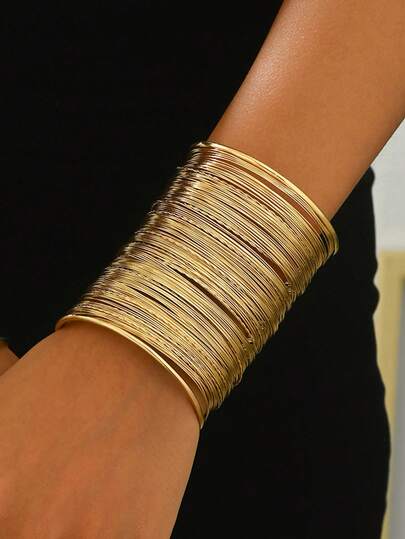 1 pieza Brazalete abierto de mujer exagerado de metal de múltiples filas de moda, versátil para usar en fiestas - Oro 846 - Añade 2