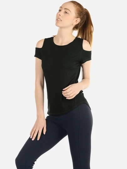 icyzone Camiseta deportiva con estiramiento alto unicolor de hombros descubiertos - Negro - Añade 4