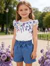 SHEIN Conjunto informal de verano para niña con parte superior con volantes y estampado de flores y mariposas, y shorts con cintura de papel y decoración de lazo