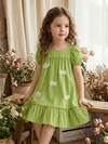 SHEIN Vintaside Kids Vestido casual elegante para niñas con cuello cuadrado, manga abullonada, línea A y volantes en el bajo, adecuado para vacaciones, fiestas, cumpleaños y primavera/verano