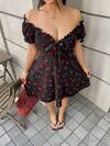 SHEIN EZwear Vestido corto de manga corta con hombros descubiertos y estampado de cerezas para tallas grandes, elegante atuendo de vacaciones, vestido casual para invitadas a boda, primavera/verano