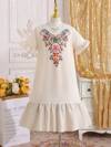 Niña vestido dorado con flores de muselina, estilo abaya, kaftan, jalabiya para Ramadán, atuendo de estilo medio oriental. Vestido largo de muselina con flores y volantes, de punto cómodo, combinado con falda de volantes