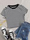 SHEIN BASICS Camiseta de cuello redondo informal de verano con estampado de rayas