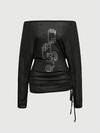 ROMWE Grunge Punk Camiseta de manga larga con hombros descubiertos, estilo punk con remaches en forma de cruz, talla grande para mujer
