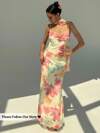 Aloruh Nuevo vestido con cuello drapeado sexy con espalda descubierta, estampado de malla con flores románticas y tirantes extra largos