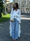 Blusa de mujer de unicolor con cuello en V, volantes plisados y mangas largas con volantes asimétricos en capas